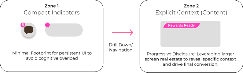 Persistent, static anchors for deferred actions. We utilized a 'Progressive Disclosure' model: simple dots at the top level to reduce noise, revealing specific counts (numbers) only as the player navigates deeper into the menu structure.