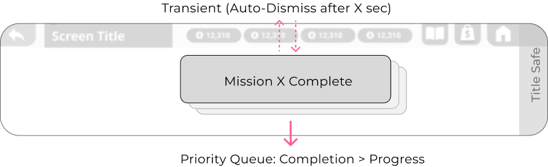 Transient, high-motion alerts reserved for immediate gratification (Level Ups, Mission Completes). These operate on a strict priority queue. completion events always override incremental progress.